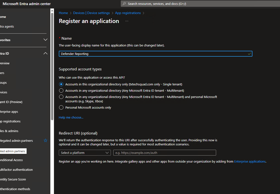 - Navigate to Entra>App Registration> New Registration> give the app a Name and click Register.