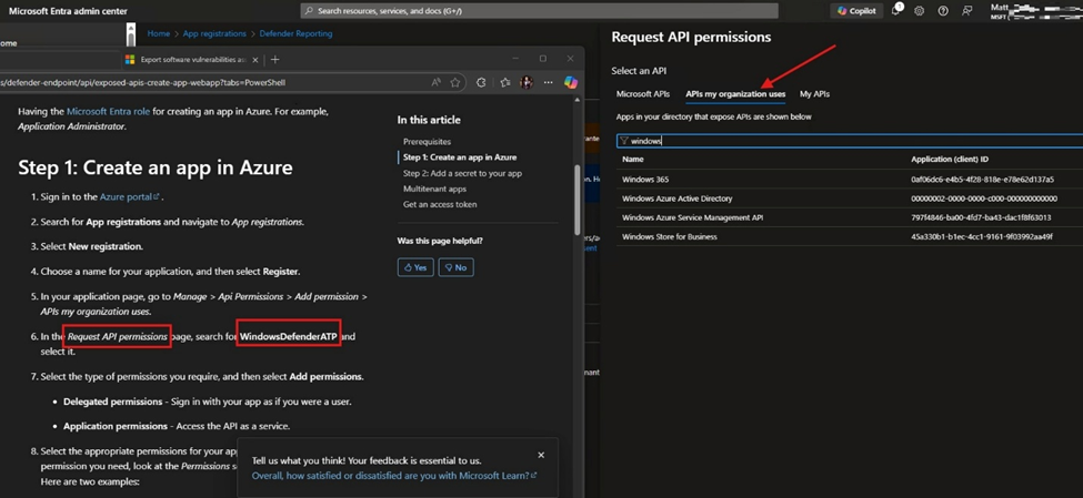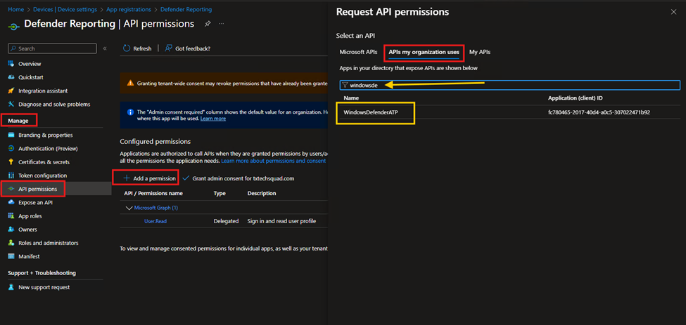 2. In the application page, the one you just created in step 1, under Manage > Api Permissions > Add permission > APIs my organization uses. In the Request API permissions page, search for WindowsDefenderATP and select it (this is what I mentioned about it is not available in the Dev tenant),