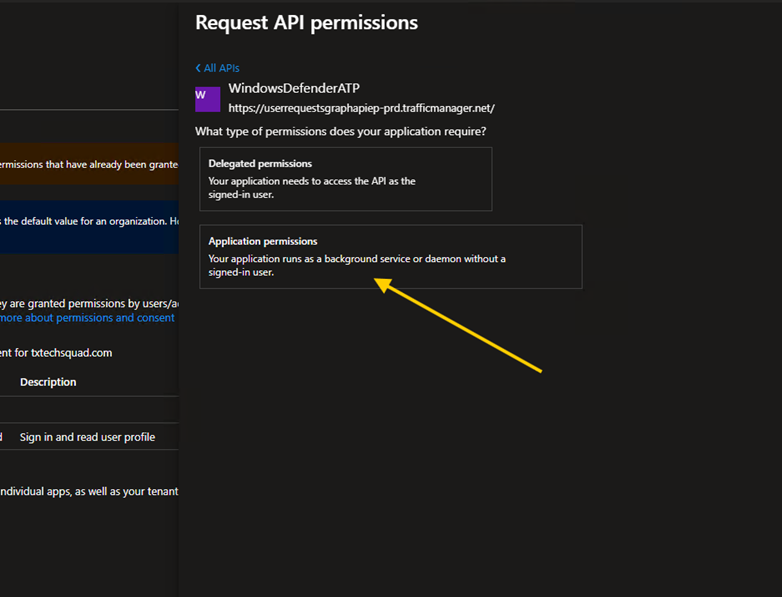 Once you select WindowsDefenderATP you get another window, select Application permission because we need to access the API as a service (while Delegated permission requires Sign in for a user
