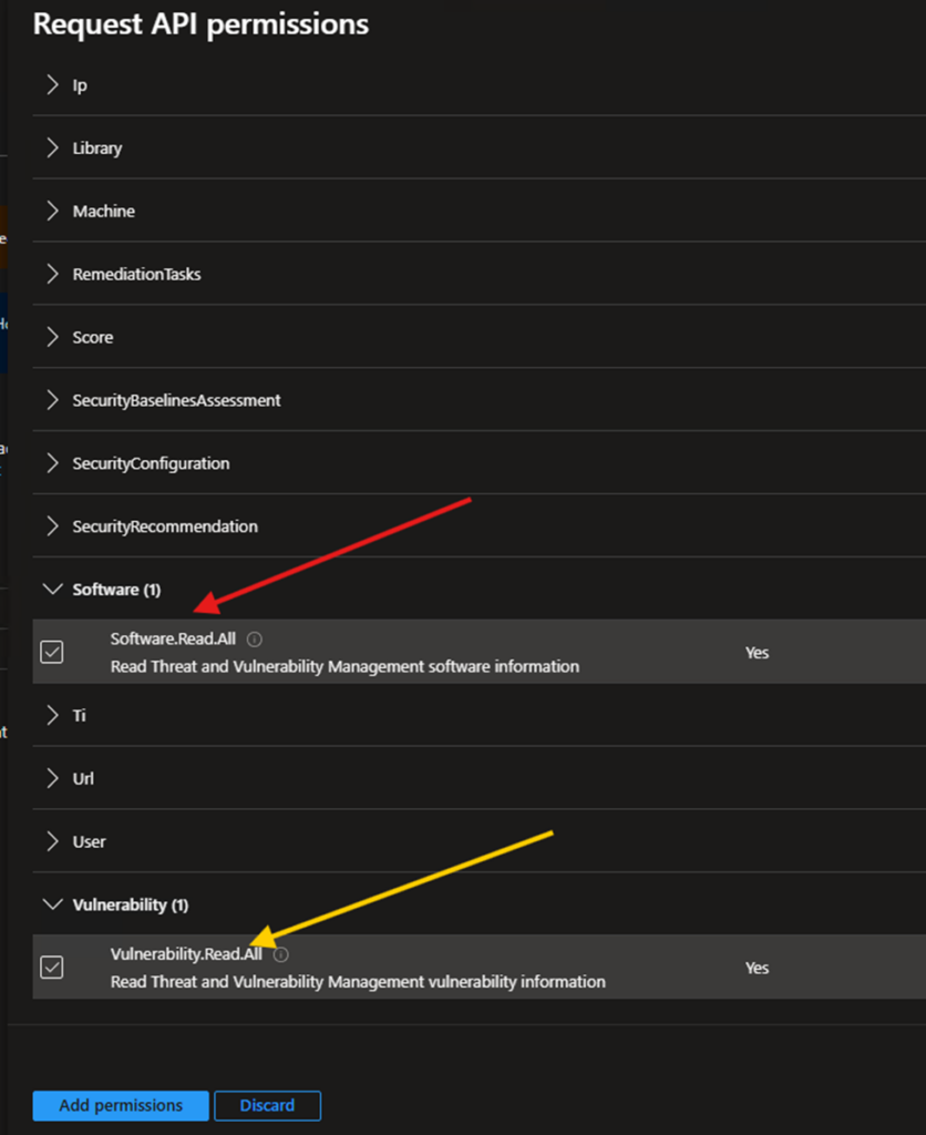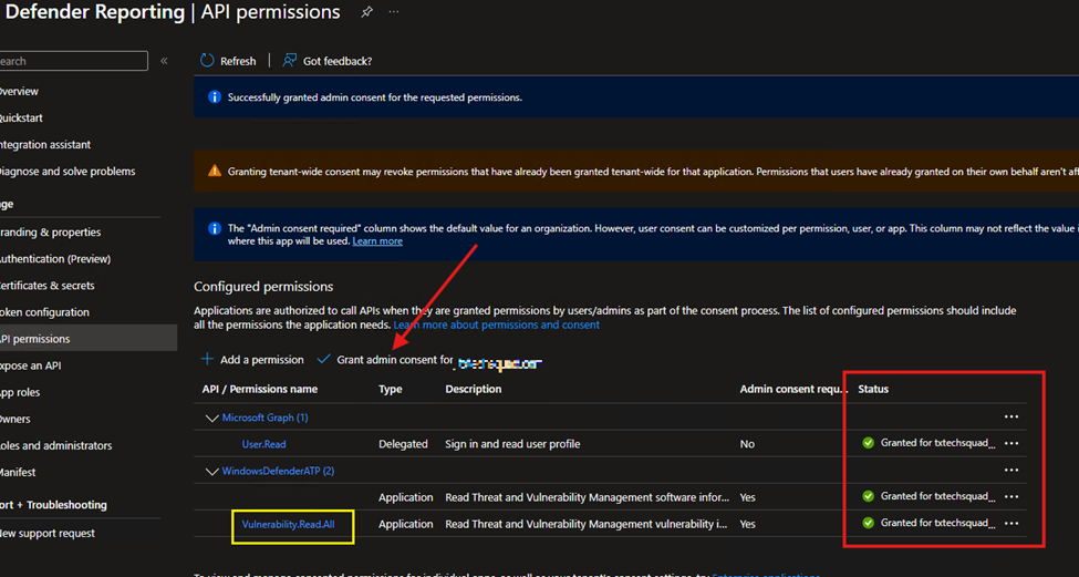 Then select API permissions for this App’s Vulnerability.Read.All’ in the screenshot below. I gave the App more permissions for something I was working on. Please follow Nathan’s recommendation.