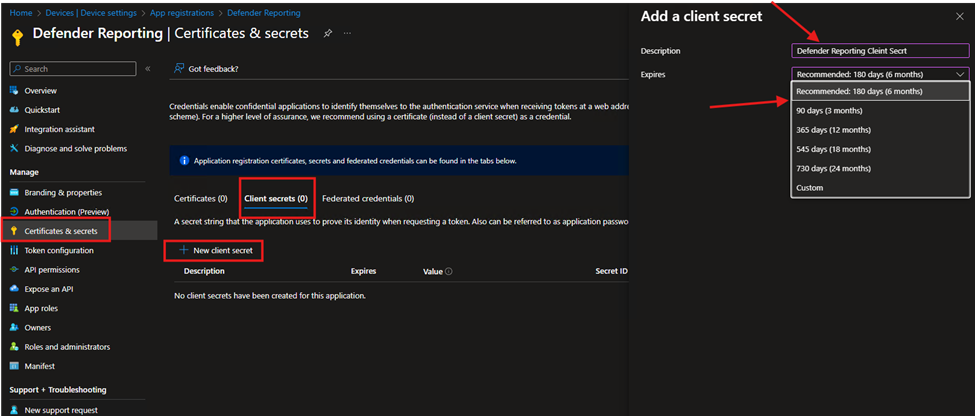 - Select New client secret, add a description and expiration date (you have between 180-730 days).