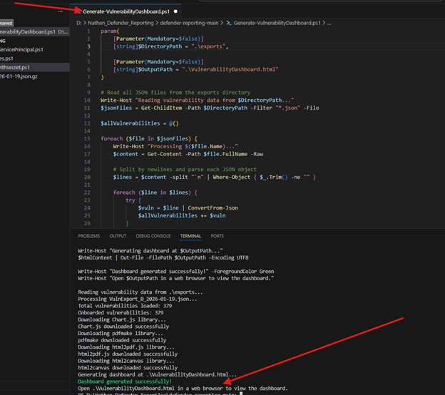 Ensure to extract it and save your JSON file in the same directory where you are going to run Generate-VulnerabilityDashboardscript you download from Nathan repo, in line number ‘3’ that what you need to place your JSON file in this folder ‘I named it as Nathan’s script, you can change it But ensure to change the name of the folder in line 3’